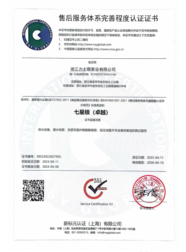 七星級(jí)(卓越)售后服務(wù)體系完善程度認(rèn)證證書(shū)